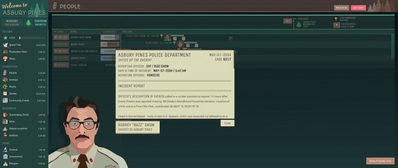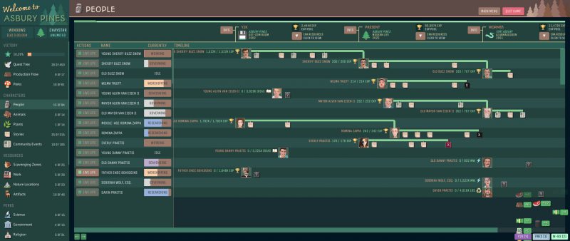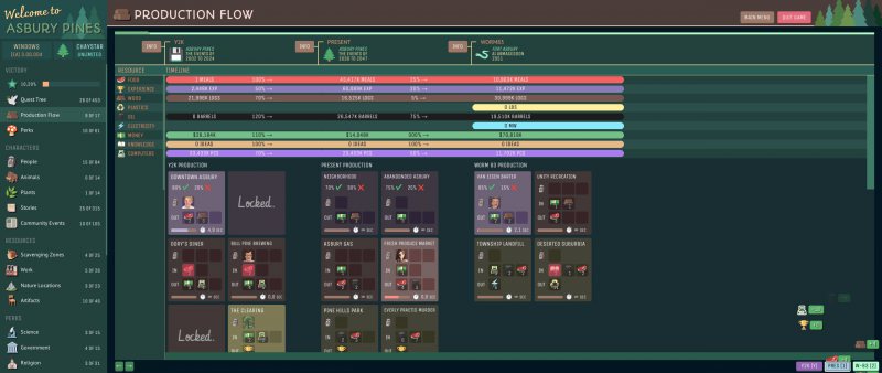 Csakhogy az Asbury Pines ezt nem egy hagyományos kalandjátékként vagy épp stratégiaként tálalja, hanem - a komplex narratívát, a több mint egy tucat időben játszódó történetvezetést, a város menedzselését, a termelési lánc kialakítását - beleszuszakolja az inkrementális / idle játékok egészen furcsa keretébe. A széles közönség által a Cookie Clickerrel és az Adventure Capitalisttal azonosított műfajban ez pedig túlzás nélkül példátlan, hiszen a "a számok egyre nagyobbra nőnek" elvet követő, sok esetben minimális interakcióval felruházott stílus a tálalást és a témát alapvetően csak vékonyka csomagolóanyagnak használja, ezzel szemben itt viszont szinte minden annak van alárendelve.